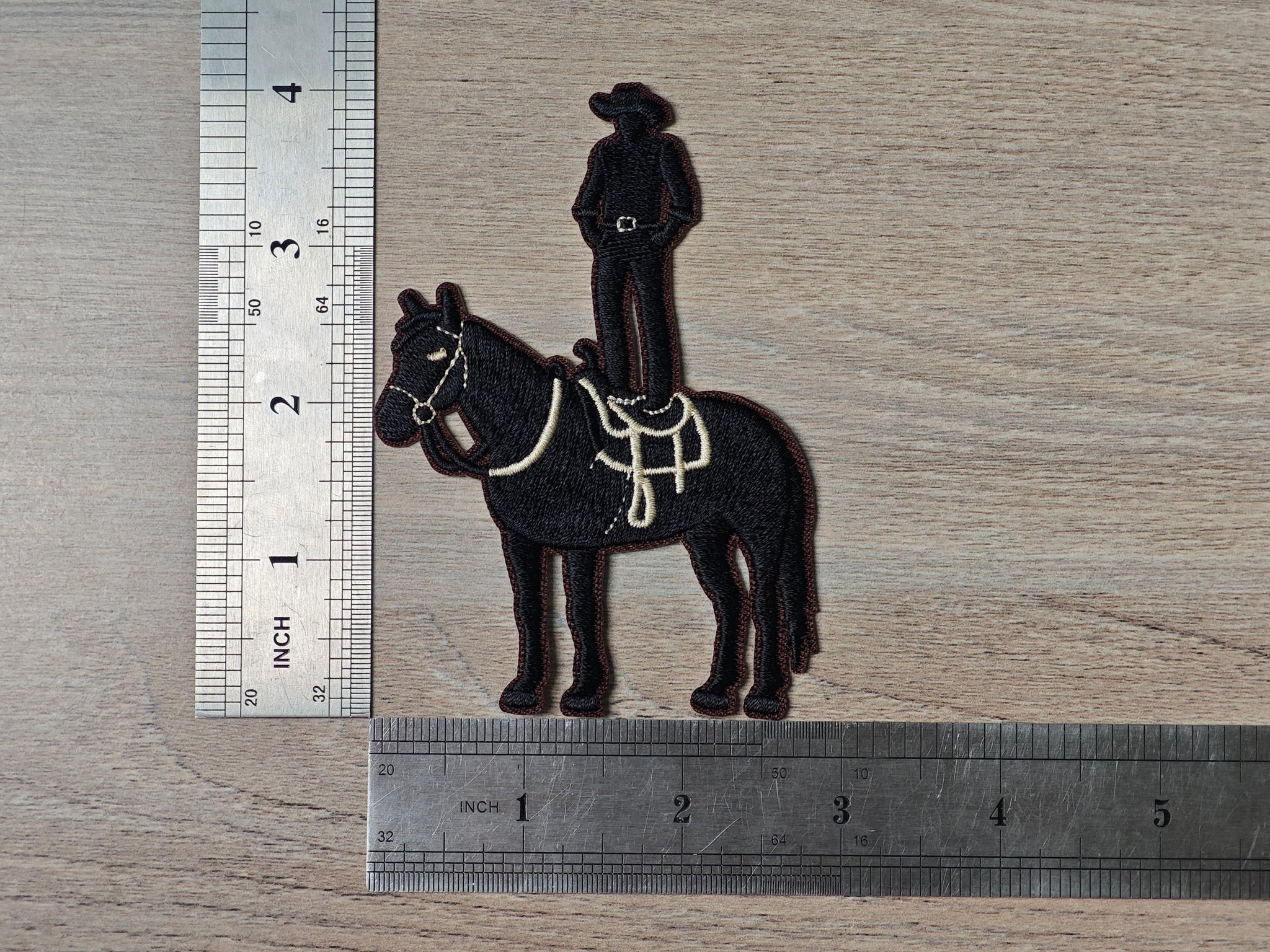 THE PRIDE I Stand On  - Embroidered Patch Cowboy Standing on Saddled Horse 4 inch x 3 inch.  Laser cut embroidered twill.